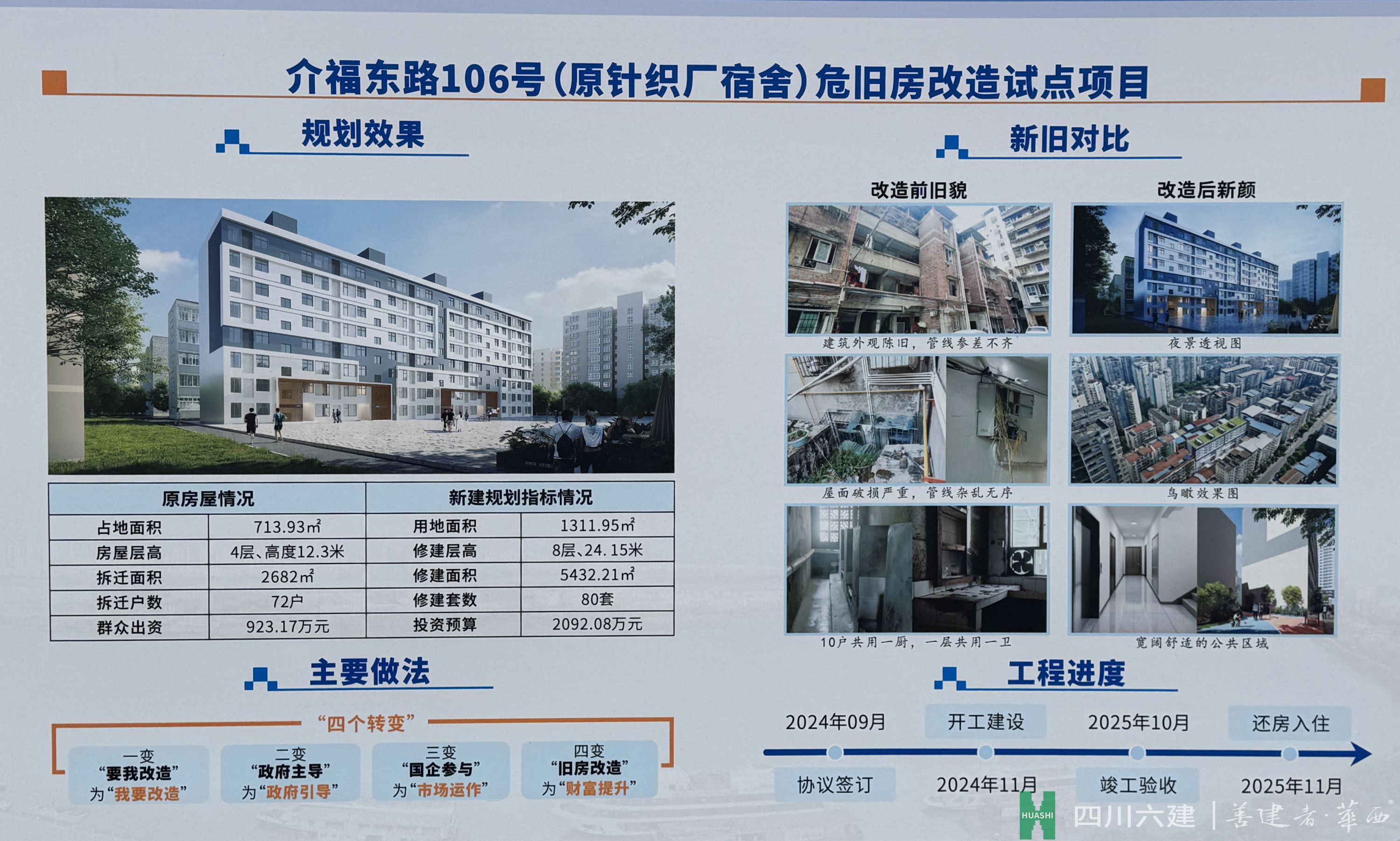 船山區(qū)介福東路106號(hào)(原針織一廠職工宿舍)危舊房改造項(xiàng)目是四川華西星輝建設(shè)有限公司在今年6月簽訂“遂寧市仁里鎮(zhèn)農(nóng)旅融合鄉(xiāng)村振興示范區(qū)項(xiàng)目”合同后的第二個(gè)落地項(xiàng)目。船山區(qū)介福東路106號(hào)(原針織一廠職工宿舍)建于上世紀(jì)80年代,經(jīng)第三方鑒定機(jī)構(gòu)鑒定為D級(jí)危房,存在較大安全隱患。此前,僅用時(shí)35天便完成業(yè)主“以舊換新”協(xié)議簽訂、房屋拆除清運(yùn)等工作,安置群眾72戶。項(xiàng)目預(yù)計(jì)在2025年10月前竣工并交付使用。