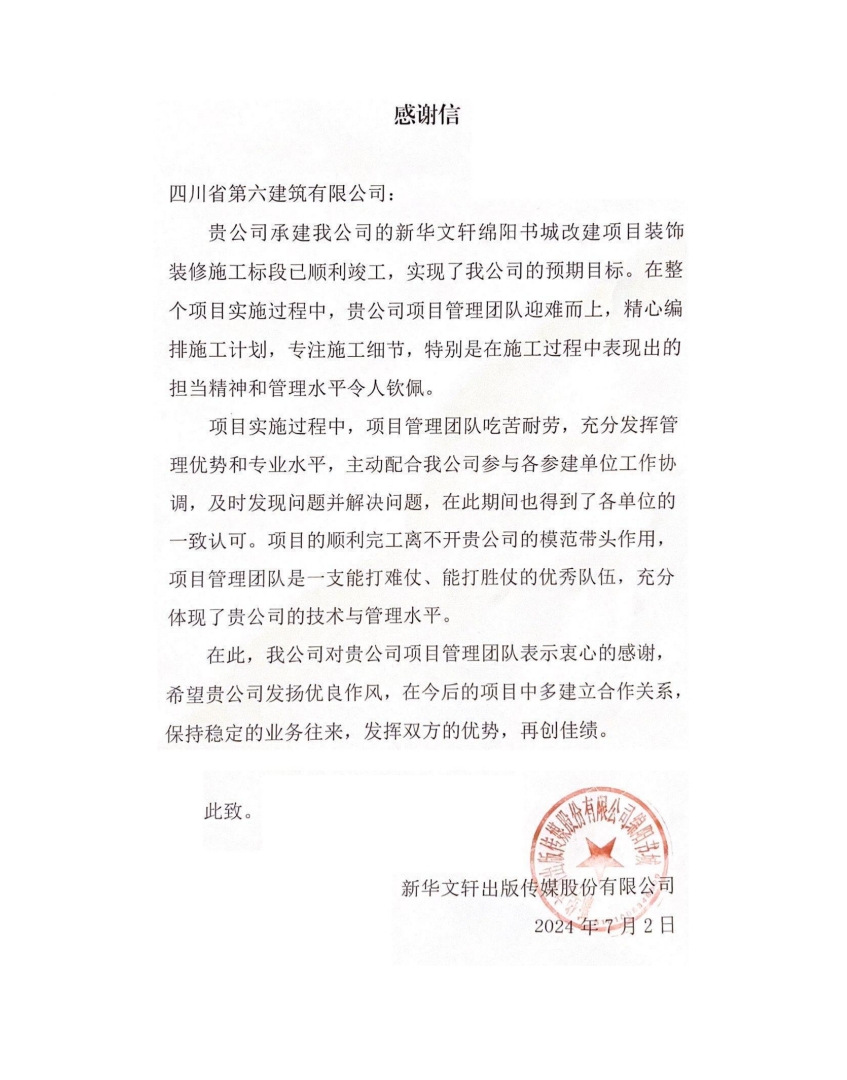 “在整個(gè)項(xiàng)目實(shí)施過(guò)程中,貴公司項(xiàng)目管理團(tuán)隊(duì)迎難而上,精心編排施工計(jì)劃,專注施工細(xì)節(jié),特別是在施工過(guò)程中表現(xiàn)出的擔(dān)當(dāng)精神和管理水平令人欽佩……”7月2日,公司收到一封來(lái)自新華文軒綿陽(yáng)書城的感謝信,字里行間都流露出對(duì)公司踐行國(guó)企擔(dān)當(dāng)?shù)馁澰S和對(duì)項(xiàng)目管理團(tuán)隊(duì)的肯定,并對(duì)今后的合作寄寓美好期待。
