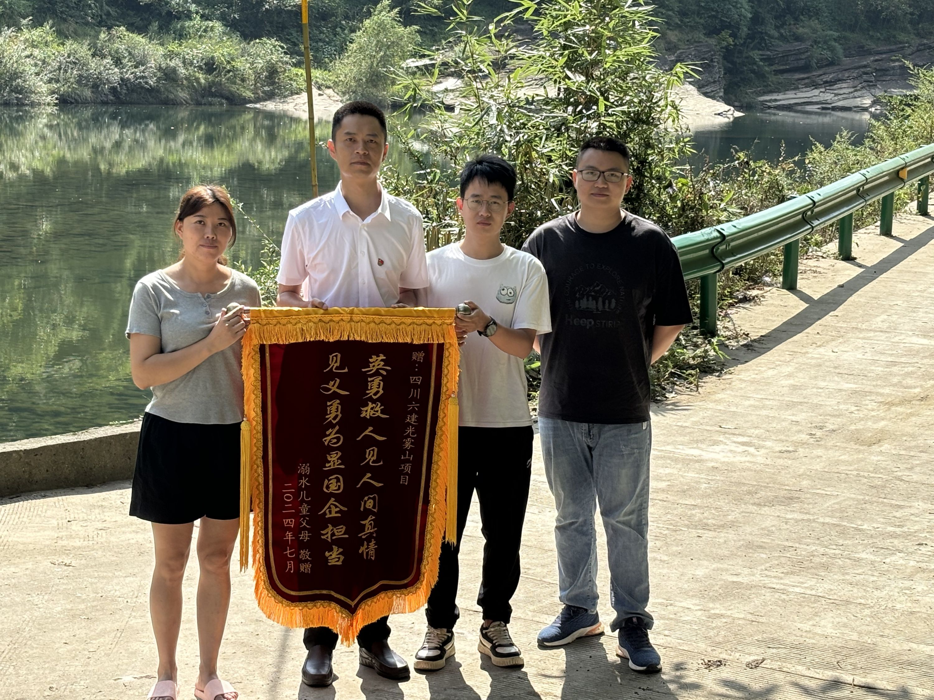 7月28日,位于光霧山旅游景區(qū)基礎(chǔ)設(shè)施建設(shè)項(xiàng)目部附近的光霧山鎮(zhèn)白頭灘村一處漫水橋面一名兒童不慎落水,值此路過(guò)的項(xiàng)目管理員王小茜、羅文、唐昆三人見狀挺身而出,合力救起了溺水兒童。幾天后,孩子家長(zhǎng)為項(xiàng)目部送來(lái)了“英勇救人見人間真情 見義勇為顯國(guó)企擔(dān)當(dāng)”錦旗。