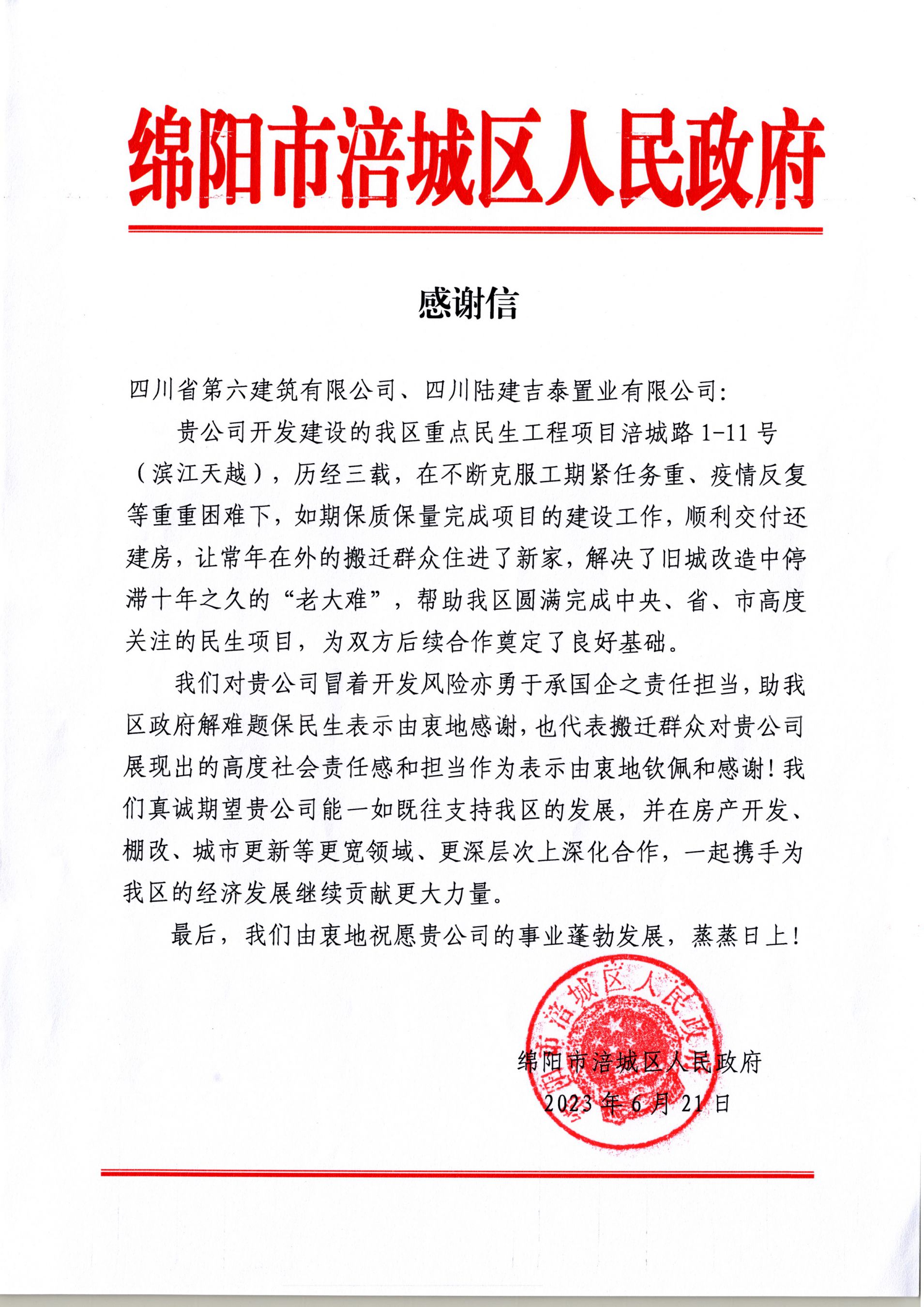 “歷經(jīng)三載,如期保質(zhì)保量完成項(xiàng)目建設(shè)工作……讓常年在外的搬遷群眾住進(jìn)了新家,解決了舊城改造中停滯十年之久的‘老大難’,幫助我區(qū)圓滿完成中央、省、市高度關(guān)注的民生項(xiàng)目……”6月21日,在一封來自綿陽市涪城區(qū)人民政府的感謝信中,他們?nèi)缡钦f道。
