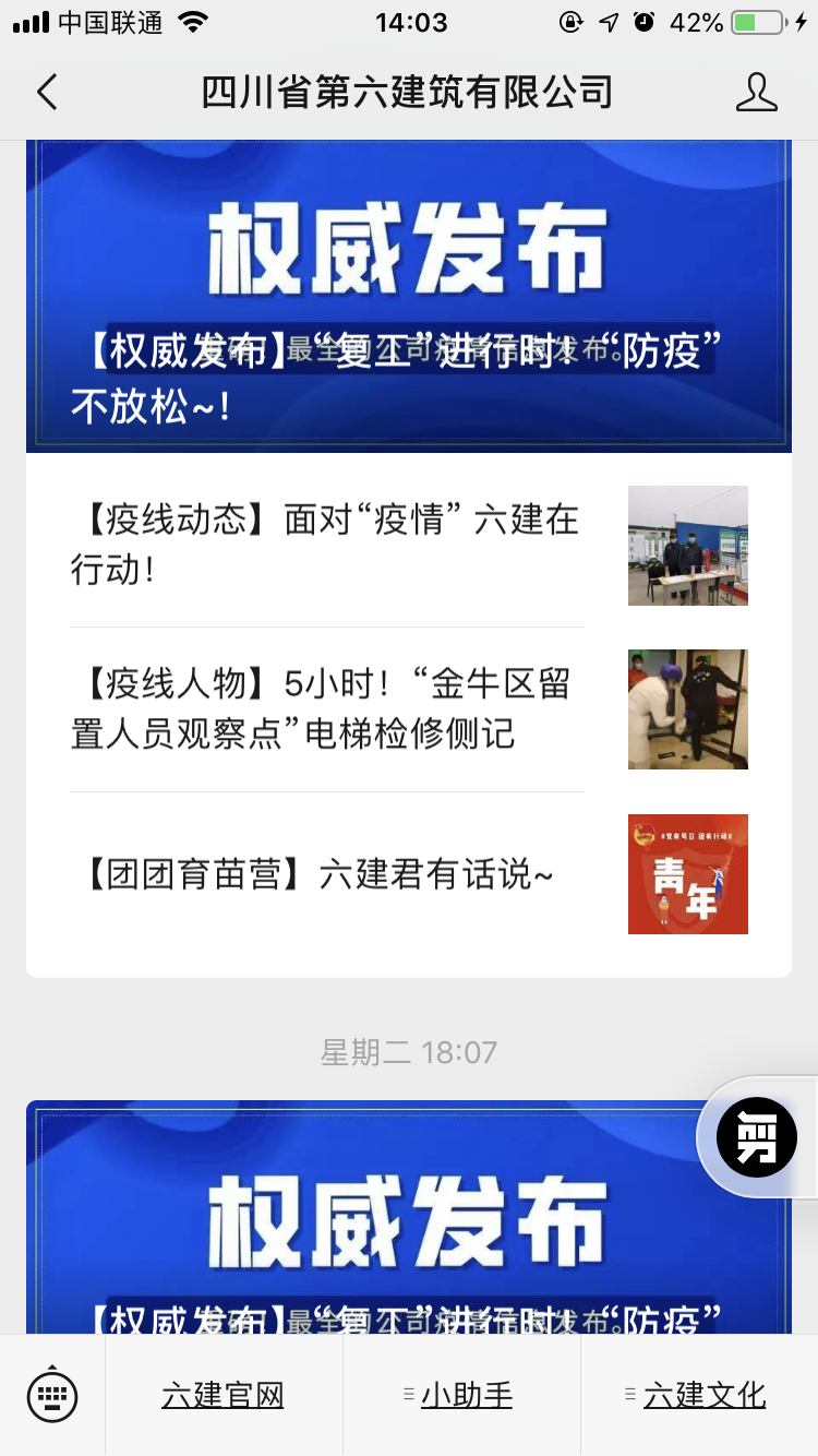 三是宣傳發(fā)動(dòng)到位。公司黨委密切關(guān)注疫情動(dòng)態(tài),積極做好輿論引導(dǎo)。善用微信公眾號(hào)正確發(fā)聲,把黨中央和國資委黨委、集團(tuán)黨委各項(xiàng)防控部署及時(shí)宣傳到位,教育引導(dǎo)黨員職工群眾不信謠不傳謠;主動(dòng)發(fā)聲,發(fā)揮典型激勵(lì)作用,通過設(shè)置《戰(zhàn)疫一線》、《疫線人物》等專欄,勾畫出六建人奮戰(zhàn)一線的群體形象,有效鼓舞了戰(zhàn)“疫”士氣,努力凝聚起眾志成城、全力以赴、共克時(shí)艱的“善建精神”。