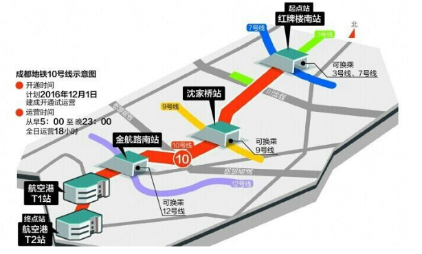 成都市地鐵10號(hào)線一期工程線路全長10.9km,全部為地下線。車站6座為:太平園、簇錦、華興、金花、空港一站、空港二站。