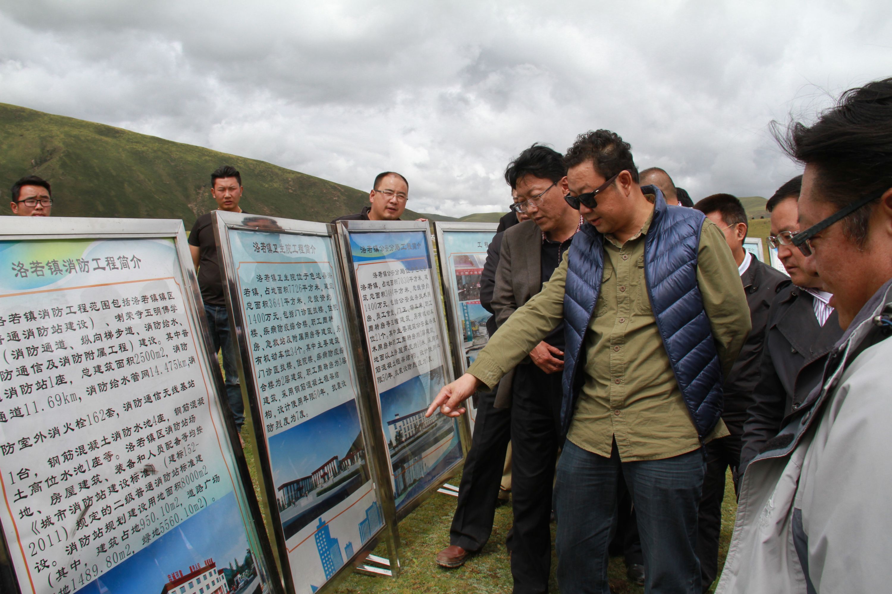 曲木史哈副省長一行來到洛若鎮(zhèn)污水處理廠、公安分局、衛(wèi)生院、福利中心施工現(xiàn)場視察后,沿正在建設(shè)中的洛若團結(jié)大道步行至第一施工段末端,又驅(qū)車來到團結(jié)大道第二施工段所在的草甸上,一邊觀看由色達縣項目促進中心和華西集團色達撤鄉(xiāng)建鎮(zhèn)工程指揮部共同布置的工程宣傳展板,一邊聽取工程負責人、色達縣更登澤郎副縣長對整個洛若撤鄉(xiāng)建鎮(zhèn)工程介紹和推進情況的匯報。隨后,曲木史哈副省長一行又前往洛若鎮(zhèn)凈水廠工地視察。