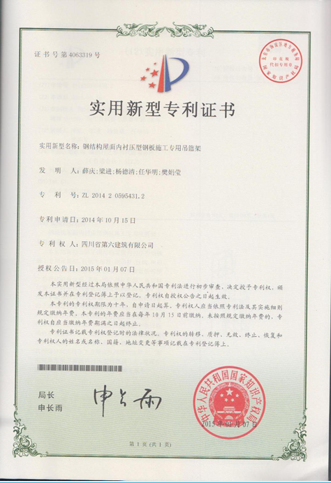 由一分公司好圣2#鑄造車間項(xiàng)目部申請的“鋼結(jié)構(gòu)屋面內(nèi)襯壓型鋼板施工專用吊籃架”榮獲國家實(shí)用新型專利,該專利于2015年1月7日起生效。