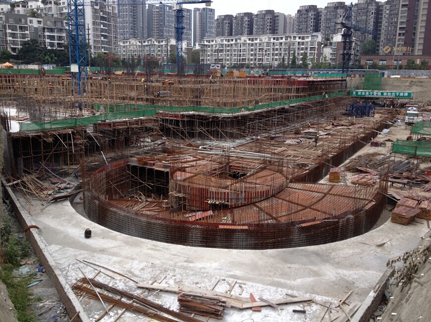 項(xiàng)目簡(jiǎn)介:“郫縣重百漢正廣場(chǎng)”是郫縣政府的重點(diǎn)建設(shè)項(xiàng)目,大型城市綜合體工程。位于郫縣郫筒鎮(zhèn),緊鄰郫縣政務(wù)中心,項(xiàng)目主立面臨郫縣主干道-東西大街,工地左側(cè)有高壓電網(wǎng)及高壓電站,施工場(chǎng)地非常狹窄。本工程共有2棟獨(dú)立塔樓、3個(gè)商業(yè)裙樓及一個(gè)地下車(chē)庫(kù)??傉嫉孛娣e19637.92㎡,建筑面積111546.97m2,建筑總高度達(dá)99.40m。地下室筏板基礎(chǔ)最厚達(dá)到1900mm,底板設(shè)有抗浮錨桿。